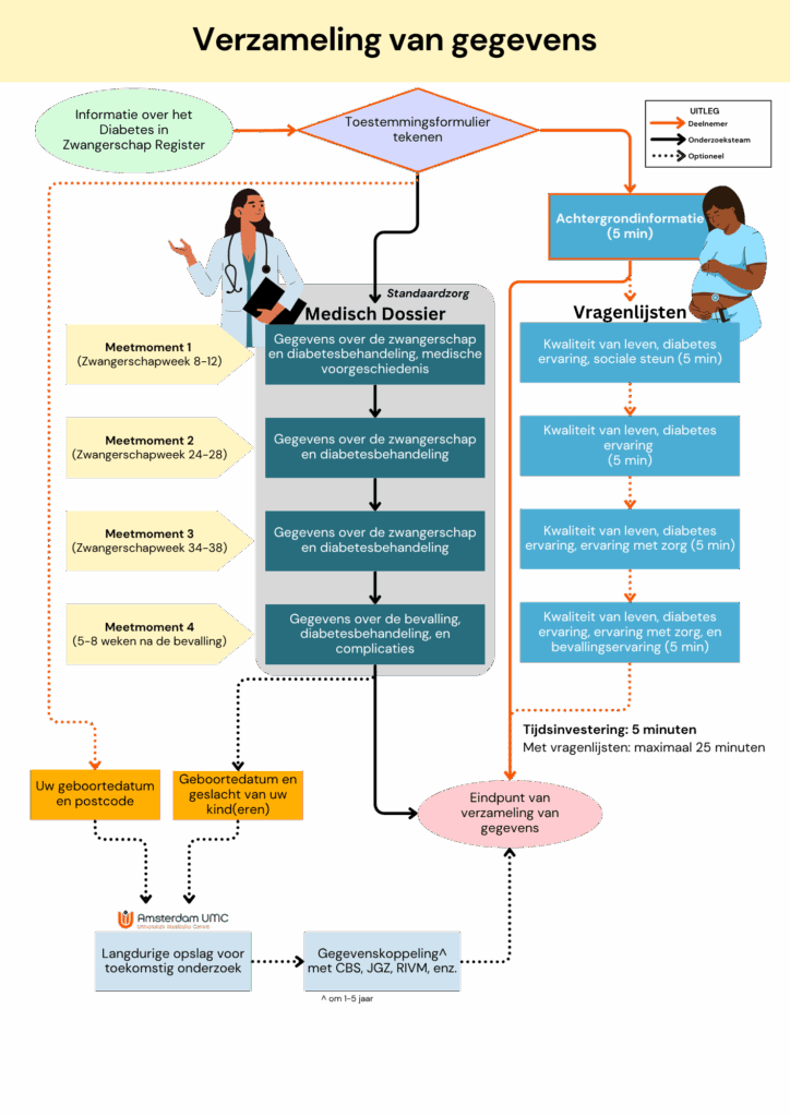 We behandelen jouw gegevens strikt vertrouwelijk en bewaren alles in beveiligde, met wachtwoorden beschermde systemen. Alleen onderzoekers die direct betrokken zijn bij het DiaPregNL Register hebben toegang tot jouw gegevens. Als je extra toestemming geeft, verzamelen we ook enkele persoonlijke gegevens. Alle data wordt veilig opgeslagen op een server van het Amsterdam UMC, in overeenstemming met de Algemene Verordening Gegevensbescherming (AVG 2016/679) en met positief advies van de Functionaris Gegevensbescherming (FG) van het Amsterdam UMC.